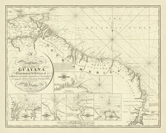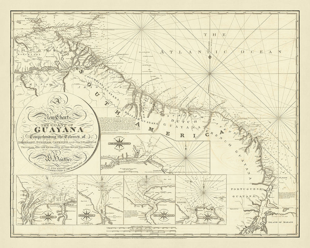 Immerse yourself in the rich history of the early 19th century with this exquisite nautical chart, "A New Chart of the Coast of Guyana Comprehending the Colonies of Demerary, Surinam, Cayenne, and the Island of Trinidad, also the Entrance to the River Orinoco, &c." Created by the renowned mapmaker William Heather in 1828, this map captures the intricate details of the coastal regions of Guyana. It provides a fascinating glimpse into the geopolitical landscape of the time, showcasing the transition of control from Dutch to British hands and the strategic importance of these territories.