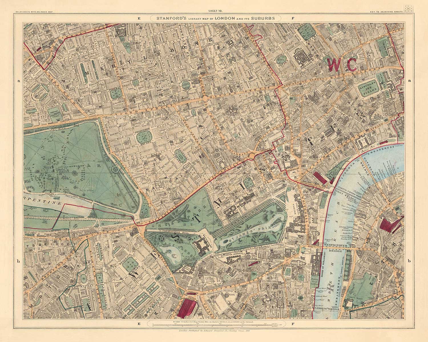 The map was originally published in 24 sheets. Altogether the map would've measured about 2 metres wide (78 inches). This here is sheet 10, which focuses on the central London borough of Westminster and parts of Lambeth.