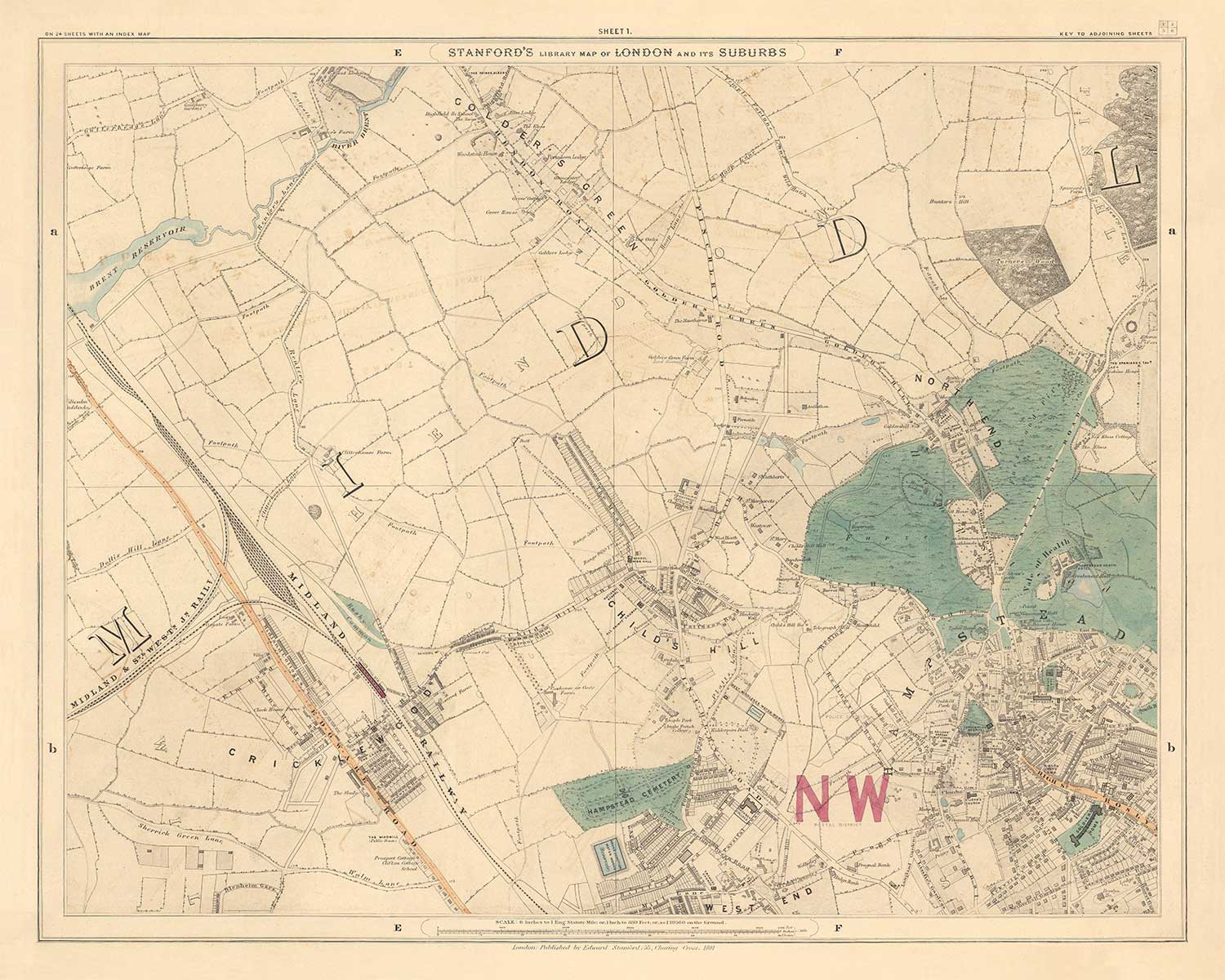 The map was originally published in 24 sheets. Altogether the map would've measured about 2 metres wide (78 inches). This here is sheet 1, which focuses on the north London boroughs of Camden, Brent and Barnet.