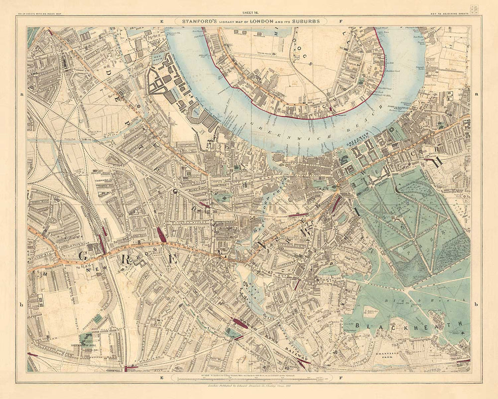 The map was originally published in 24 sheets. Altogether the map would've measured about 2 metres wide (78 inches). This here is sheet 16, which focuses on the towns of Greenwich and Deptford and the south London boroughs of Greenwich and Lewisham.