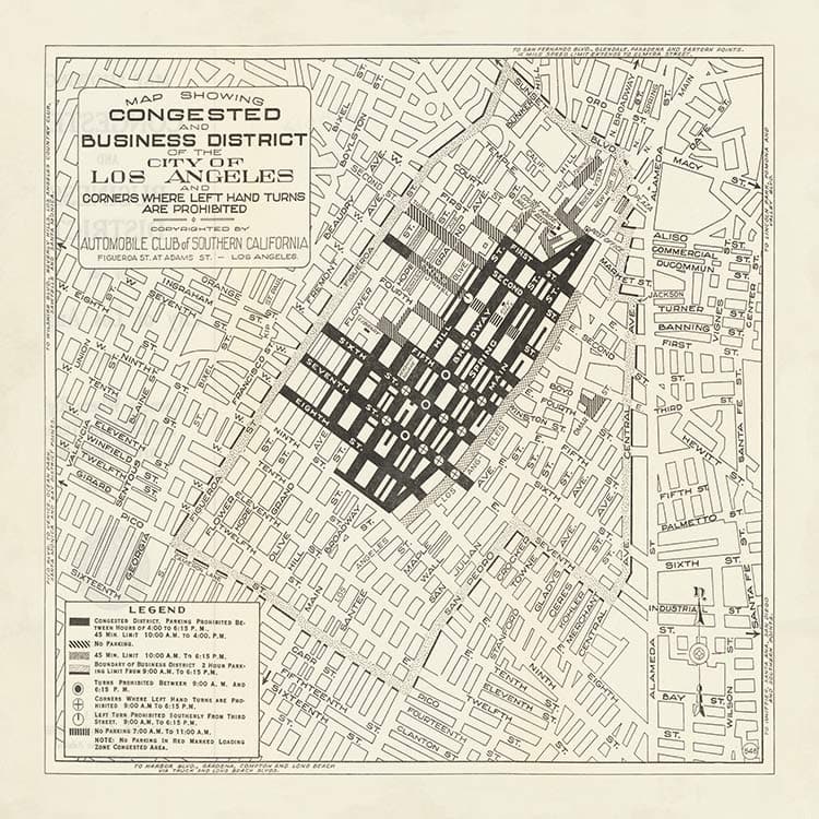 This is one of the world's first maps for motorists. The legend in the bottom left corner shows you a key of the information available on this map, including parking restrictions, when and where left turns are allowed, and the "congested district" where parking is prohibited during busy hours.
