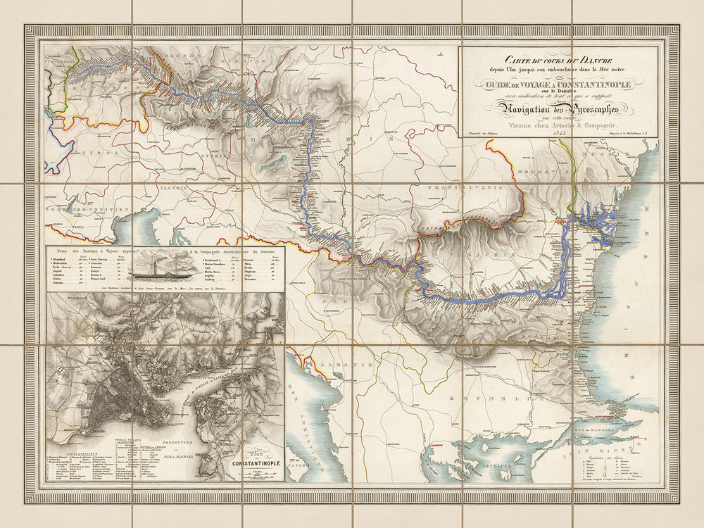 Old Danube River Steamship Route Map, 1843: From Bavaria to the Black Sea, Austria, Hungary, Romania