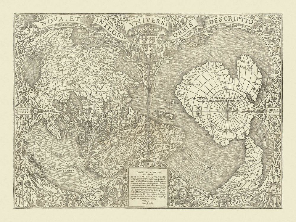 Step into the fascinating world of Renaissance cartography with Oronce Fine’s “Nova, et Integra Universi Orbis Descriptio,” a masterwork first published in 1531. This extraordinary map, the earliest known double cordiform (heart-shaped) projection of the world, stands as a testament to both the ambition and artistry of early modern mapmakers. Fine, an eminent French mathematician and geographer, ingeniously synthesized the latest discoveries of his era—most notably the voyages of Magellan and Cortez—into a vision of the globe that was both scientifically advanced and visually arresting. The map’s original Latin title, which translates to “A New and Complete Description of the Whole World,” perfectly encapsulates its groundbreaking scope and the spirit of exploration that defined the age.