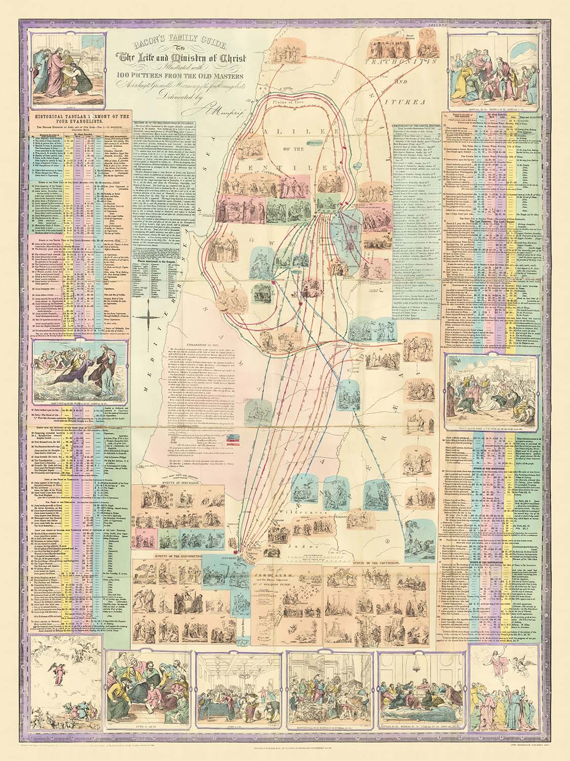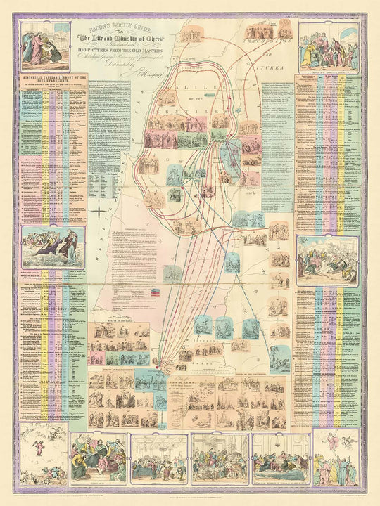 Bacon's Family Guide To The Life and Ministry of Christ Illustrated with 100 Pictures from the Old Masters is a remarkable 19th-century lithograph, imagined by Robert Mimpriss and published in 1873. This artwork was specially designed for instructing both children and adults in the pivotal moments of the Gospel, bringing together a wealth of biblical stories and their timeline in a highly visual format. Shaded in refined, muted tones, the print seamlessly guides the viewer through the harmony of the four Evangelists, following the celebrated arrangements by Edward Greswell, whose influential biblical scholarship inspired Mimpriss’s detailed educational system.