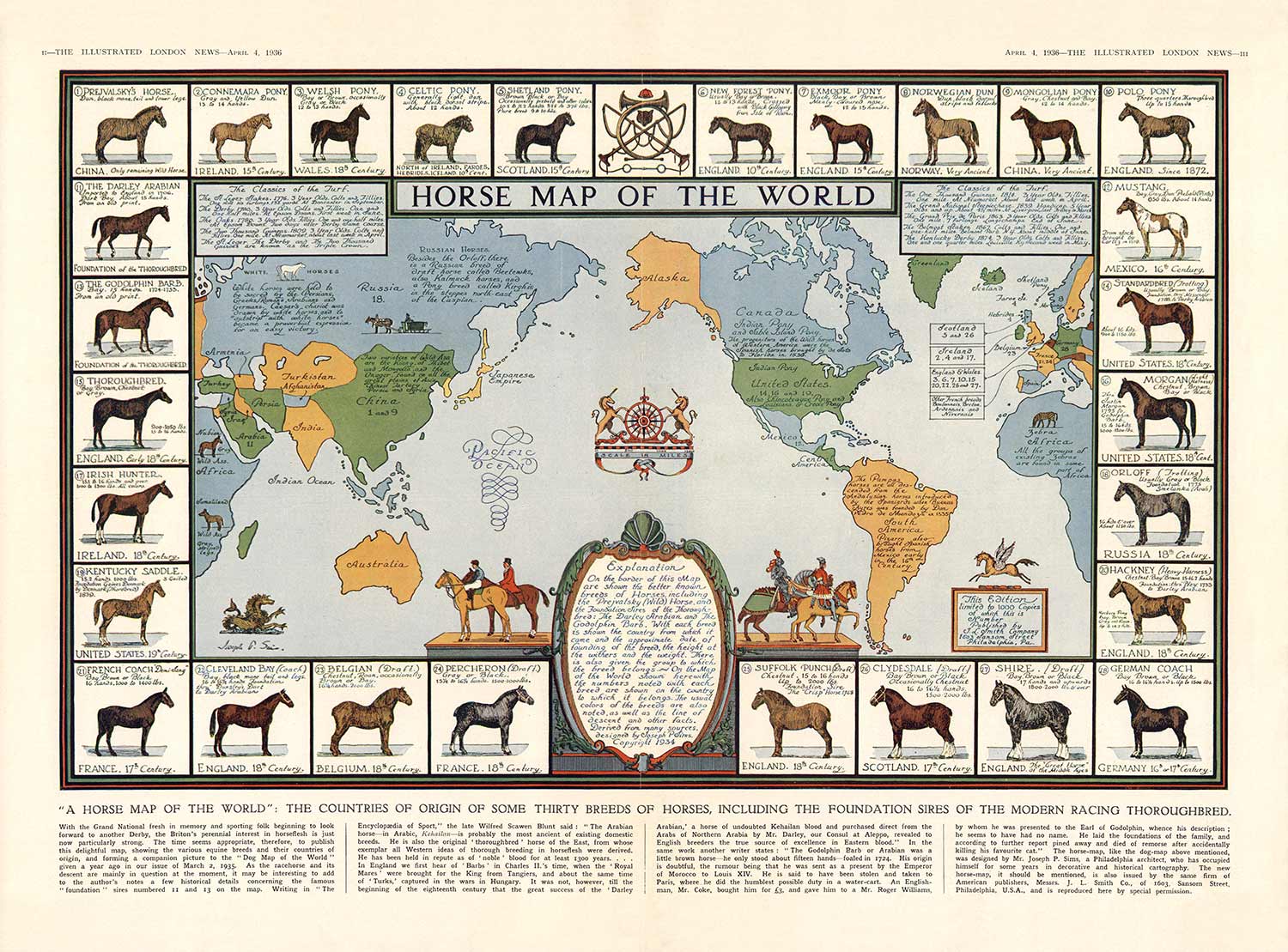 Old Horse Map, 1936: Old World Atlas Chart with Origins of Breeds