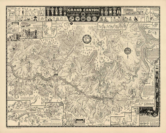 Old Illustrative Map of The Grand Canyon in 1931 by Jo Mora: Arizona, Colorado River, Horseshoe Bend, Native Americans