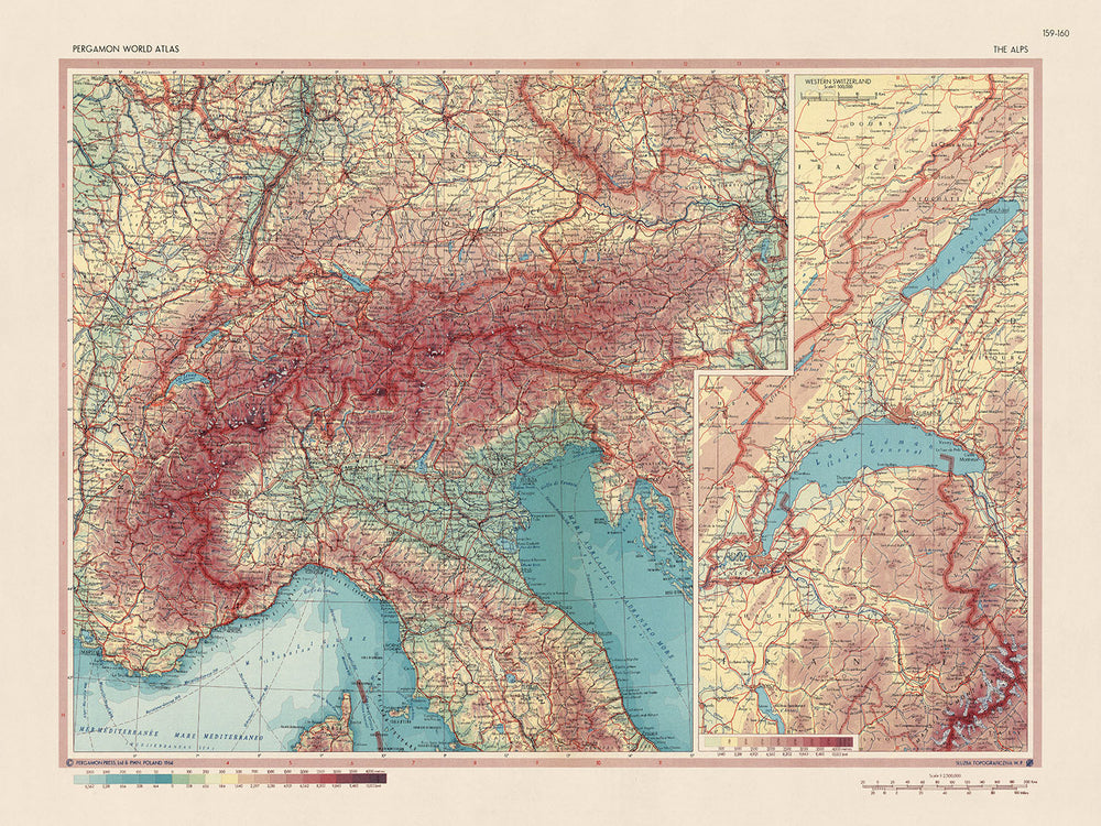 Immerse yourself in the captivating allure of the 'Alps', a meticulously detailed political and physical map, originally brought to life in 1967 by the esteemed Polish Army Topography Service. As a national country map, it offers an intriguing perspective of the larger geographical region it inhabits, meticulously charting the complex interplay of political boundaries and natural features. Notably, the map includes an additional map of Western Switzerland at a scale of 1:500,000, a testament to the mapmaker's dedication to comprehensive coverage and precision.