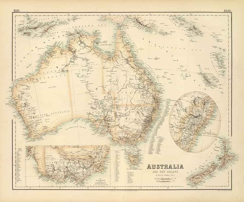 Old Map of Australia & New Zealand, 1872 by Fullarton: Tasmania, Van Diemens Land, Sydney, Auckland, Victoria, NSW