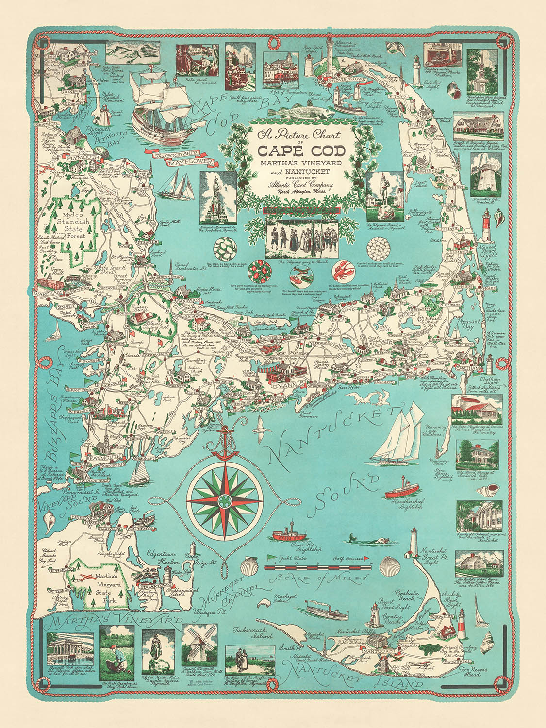 Old Map of Cape Cod, Martha's Vineyard, and Nantucket, 1949 by E. Chase: A Pictorial Adventure