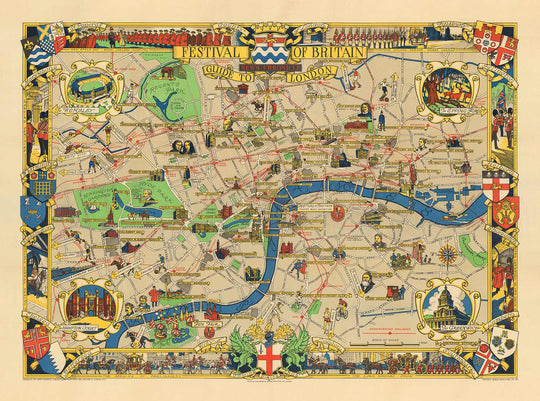 The map shows you all of the interesting things that were going on in London as part of the Festival, along with which Underground lines to take to get there. There's also a bunch of portraits and vignettes showing various famous people and landmarks.