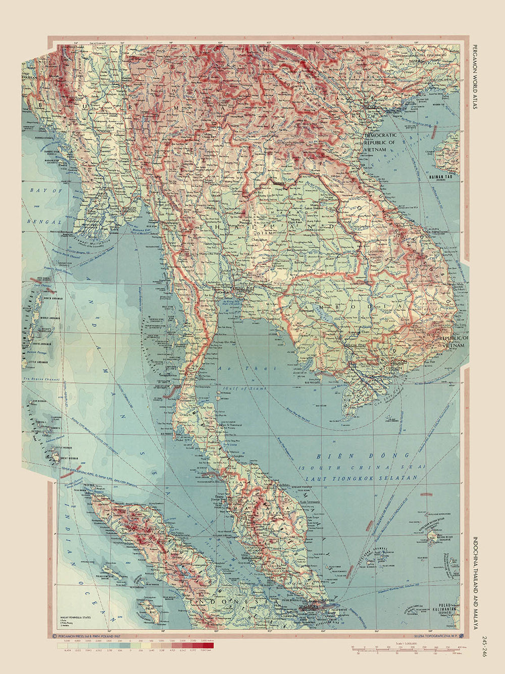 This 1967 map of Indonesia, Thailand, and Malaya, published by the Polish Army Topography Service, is a detailed political and physical map that provides a comprehensive overview of the region. The map is centered on the Malay peninsula, with Thailand to the northwest and Malaysia to the southwest. The map extends covers most of Southeast Asia, including Vietnam, Cambodia, Myanmar, etc.