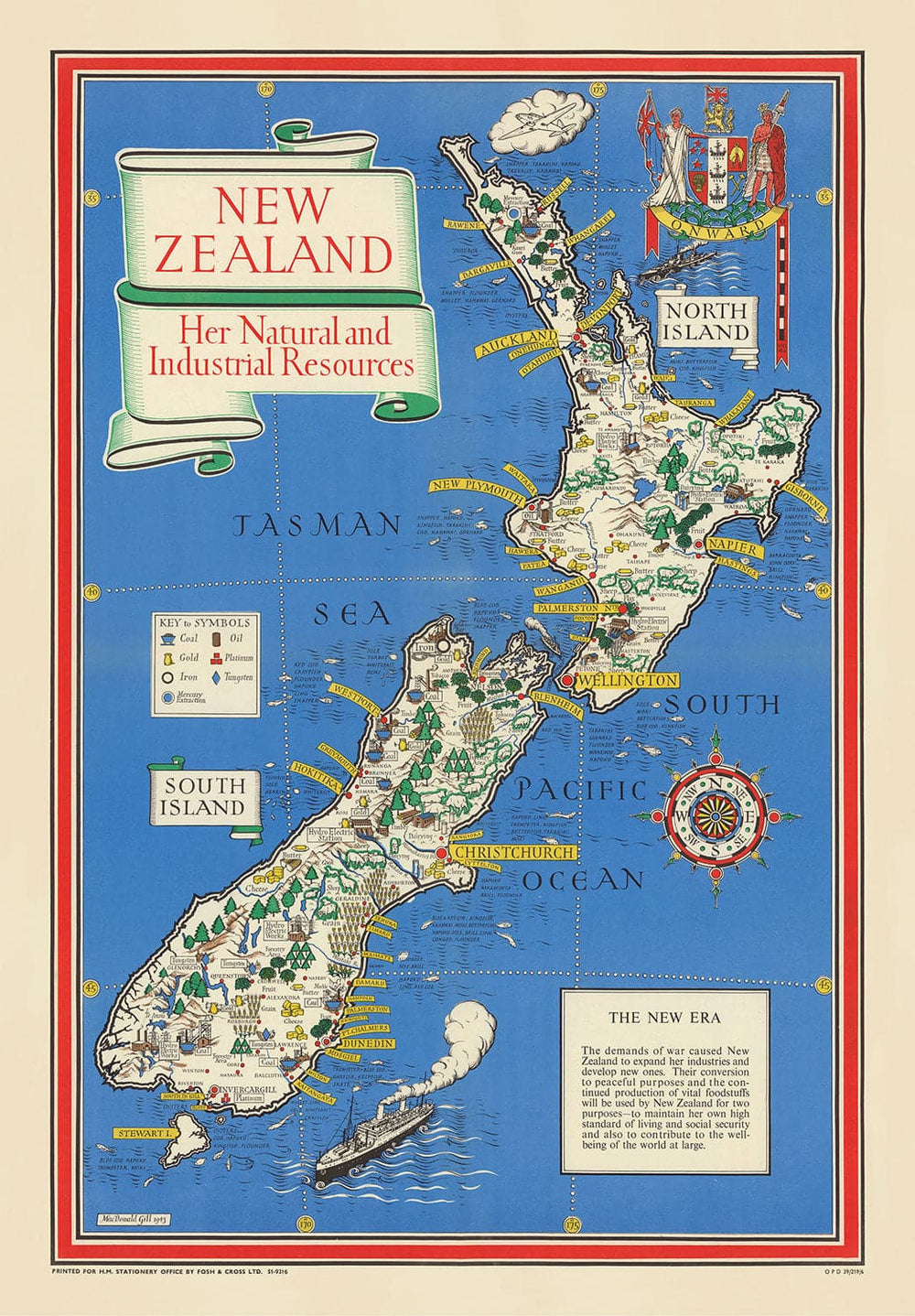 The map focuses on the industrial and natural resources of the North and South Islands of New Zealand, showing how the country has had to 'expand her industries and develop new ones' to help with the War. The map also shows how New Zealand is continuing 'production of vital foodstuffs... to maintain her own high standard of living and social security, and also to contribute to the well-being of the world at large.'