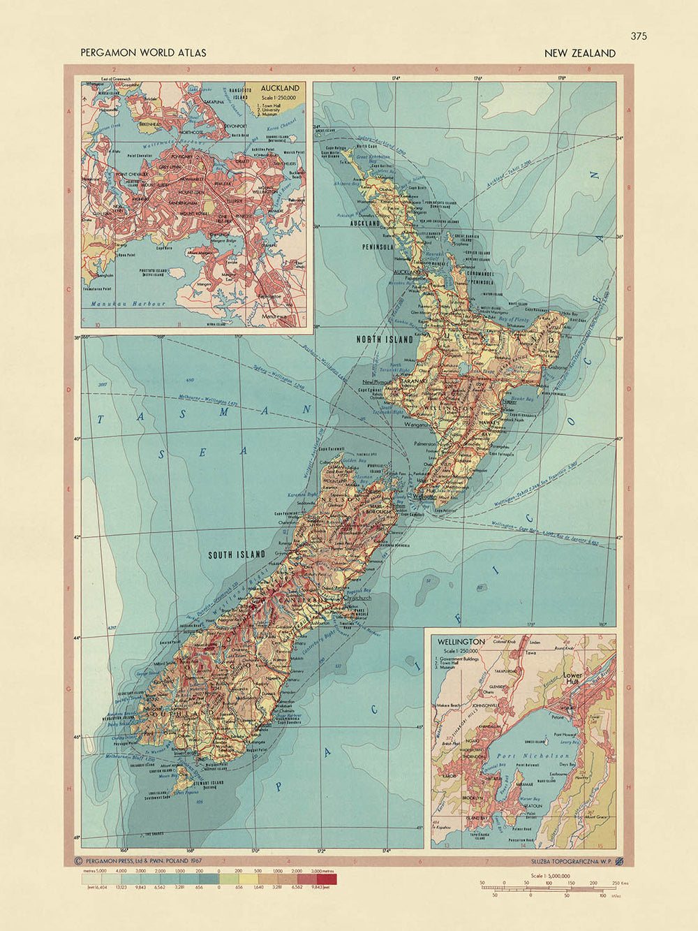 This 1967 map of New Zealand, published by the Polish Army Topography Service, is a detailed political and physical map that provides a comprehensive overview of the country's geography and political divisions. The map's scale is 1:2,500,000, making it an ideal resource for travelers, historians, and anyone interested in the geography of New Zealand.