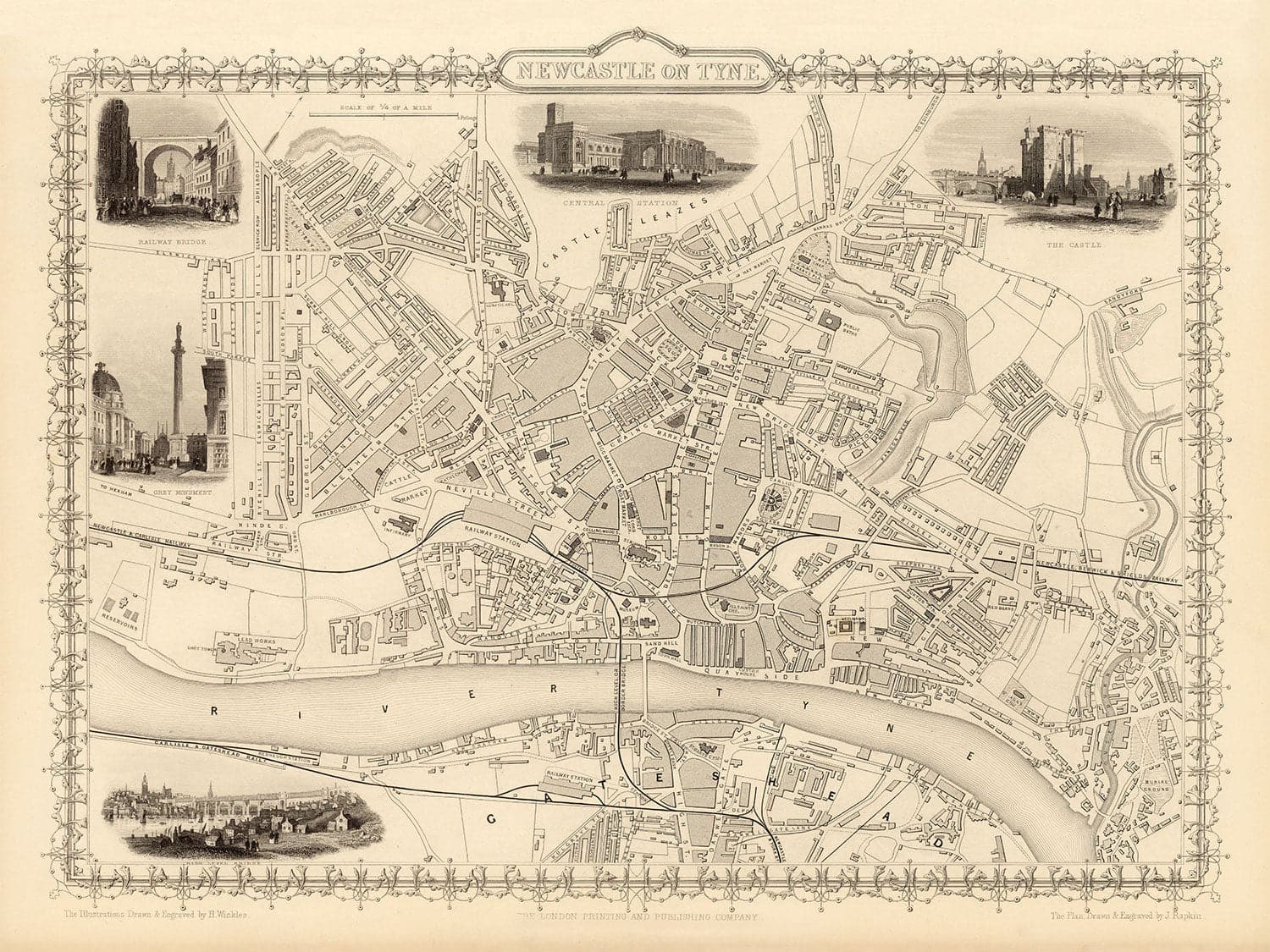 Engraved by John Rapkin and published by J. Tallis & Co in 1851, this is one of the finest and most detailed historic maps of Newcastle that you can find from the peak of industrialised Victorian Britain.