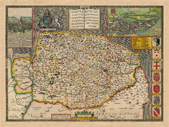 Old Map of Norfolk, 1611 by John Speed: Norwich, Great Yarmouth, King's Lynn, Thetford