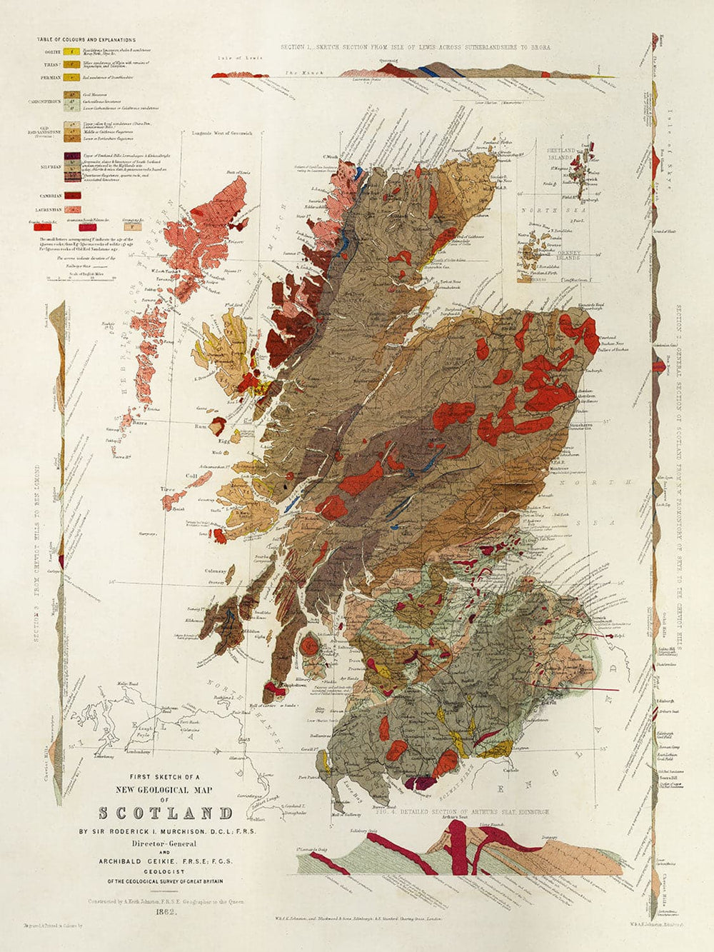 This is a beautiful old geological map of Scotland. One of the first geology maps of Scotland, it is actually the first sketch of a Scottish geology map put together by Roderick I. Murchison and Archibald Geikie (director of the Geological Survey of Scotland) and published by AK Johnston in 1862.