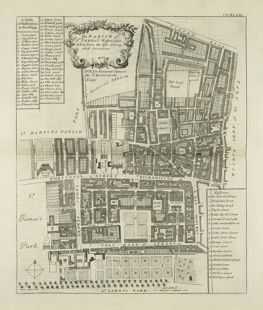This wonderful old map of the Parish of Saint James's of Westminster was originally published in 1720. It was created by John Strype & John Stow.