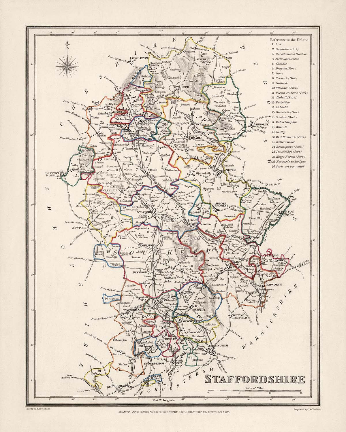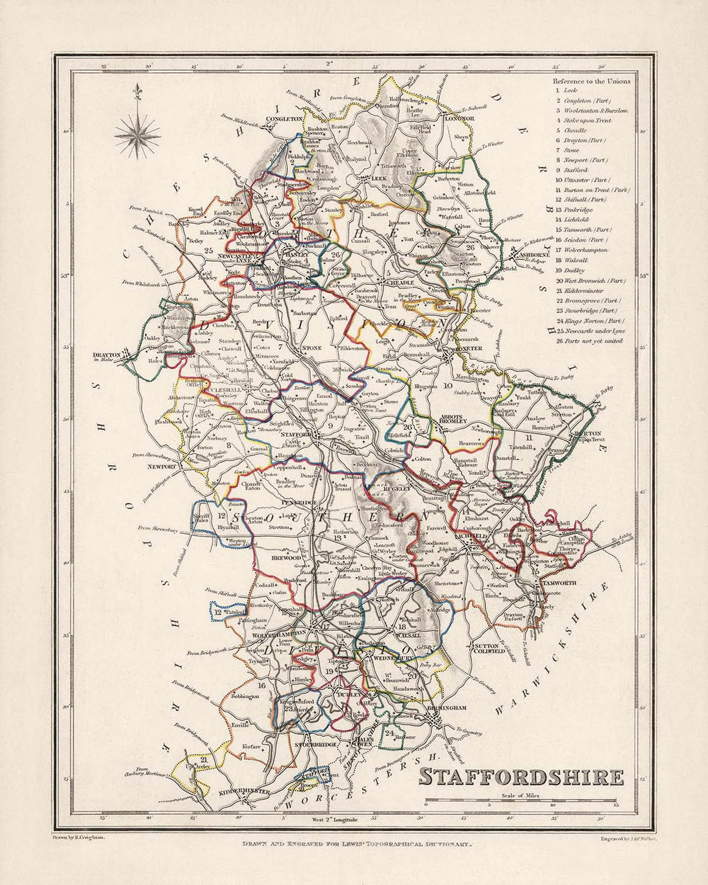 Embrace the allure of history with the Old Map of Staffordshire by Samuel Lewis, 1844. This meticulously detailed map provides a glimpse into the past, showcasing the region's main towns, cities, and other intriguing features. With its historical significance and exquisite craftsmanship, this map is a must-have for collectors, history enthusiasts, and anyone seeking to explore the rich heritage of Staffordshire, England.