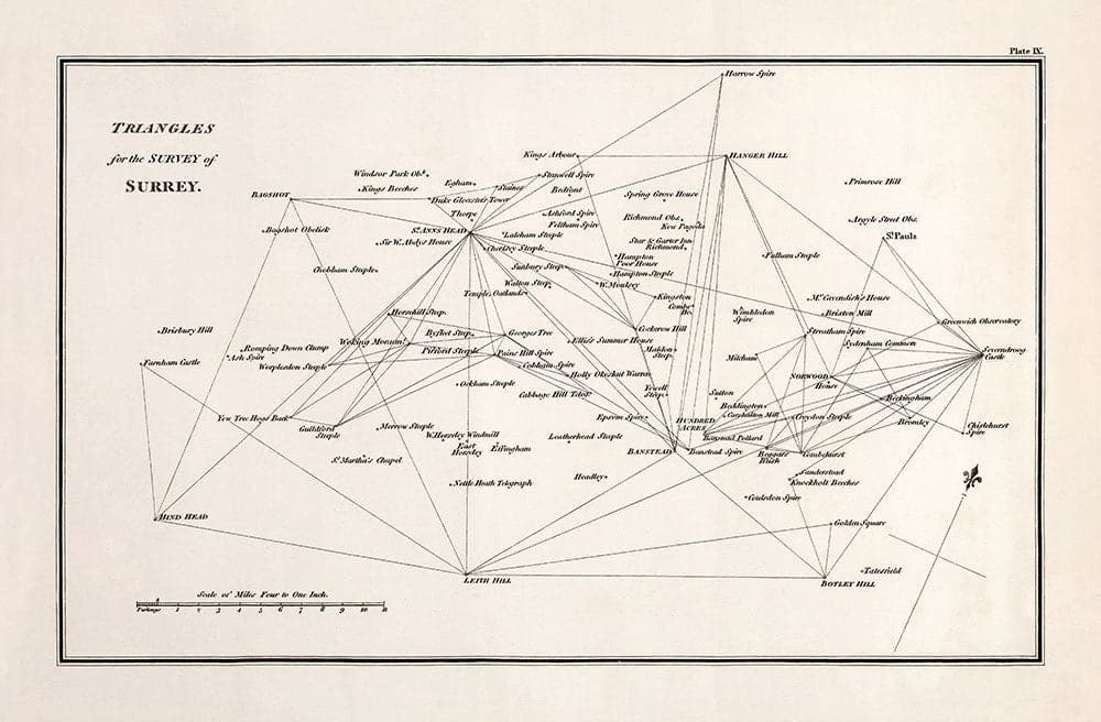 This is literally a map of triangles - but they're very important triangles. They're highly accurate triangles between various points of Surrey, measured using theodolites.