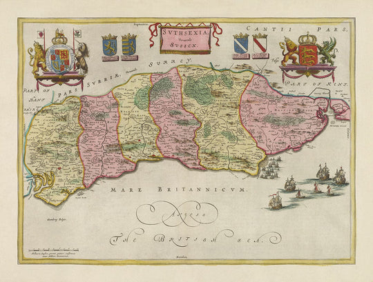 Old Map of Sussex in 1665 by Joan Blaeu: East, West, Mid Sussex, Worthing, Crawley, Brighton, Bognor, Eastbourne