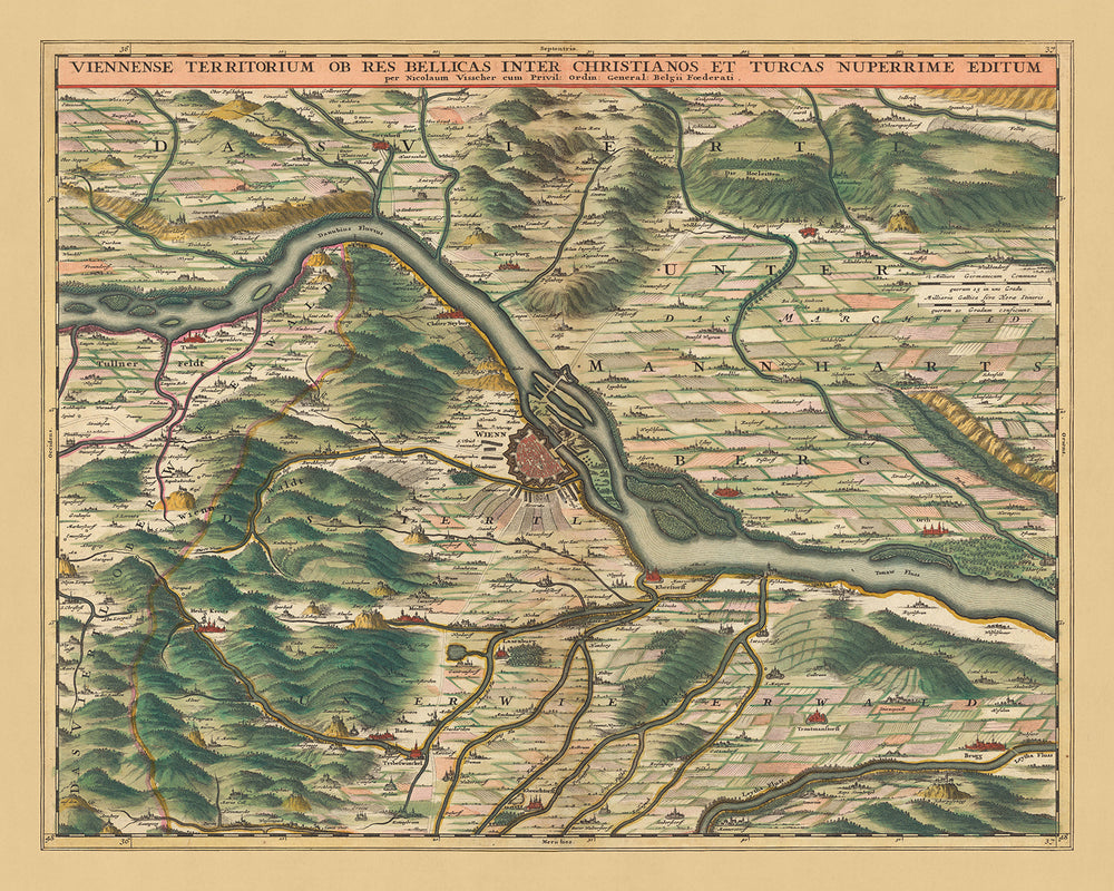 Nicolaes Visscher II, the creator of this map, was the grandson of Claes Janszoon Visscher, one of the most renowned mapmakers of the Dutch Golden Age. The Visscher family's legacy of precision and artistic excellence is evident in this map. It is not just a cartographic representation of the territory around Vienna, but also a piece of art that reflects the mastery of a celebrated mapmaker from a golden era of cartography. This map is a must-have for collectors and history enthusiasts alike, offering a unique opportunity to own a piece of history that tells a story of a region and a time that shaped the world as we know it today.