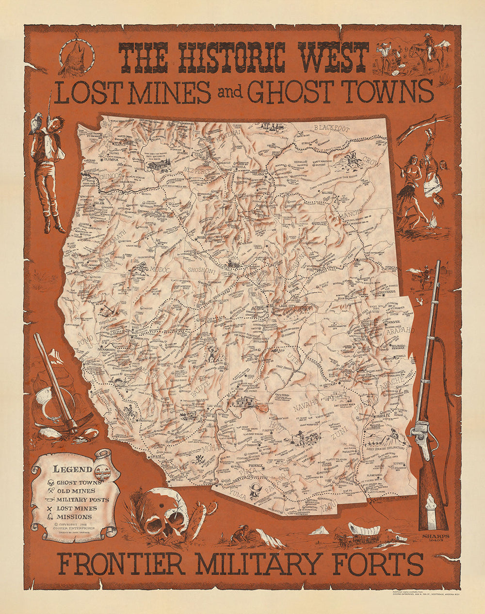 Old Map of the American Wild West by Andy Dagosta in 1968: Cowboys, Indians, Outlaws, Frontier, Oregon Trail