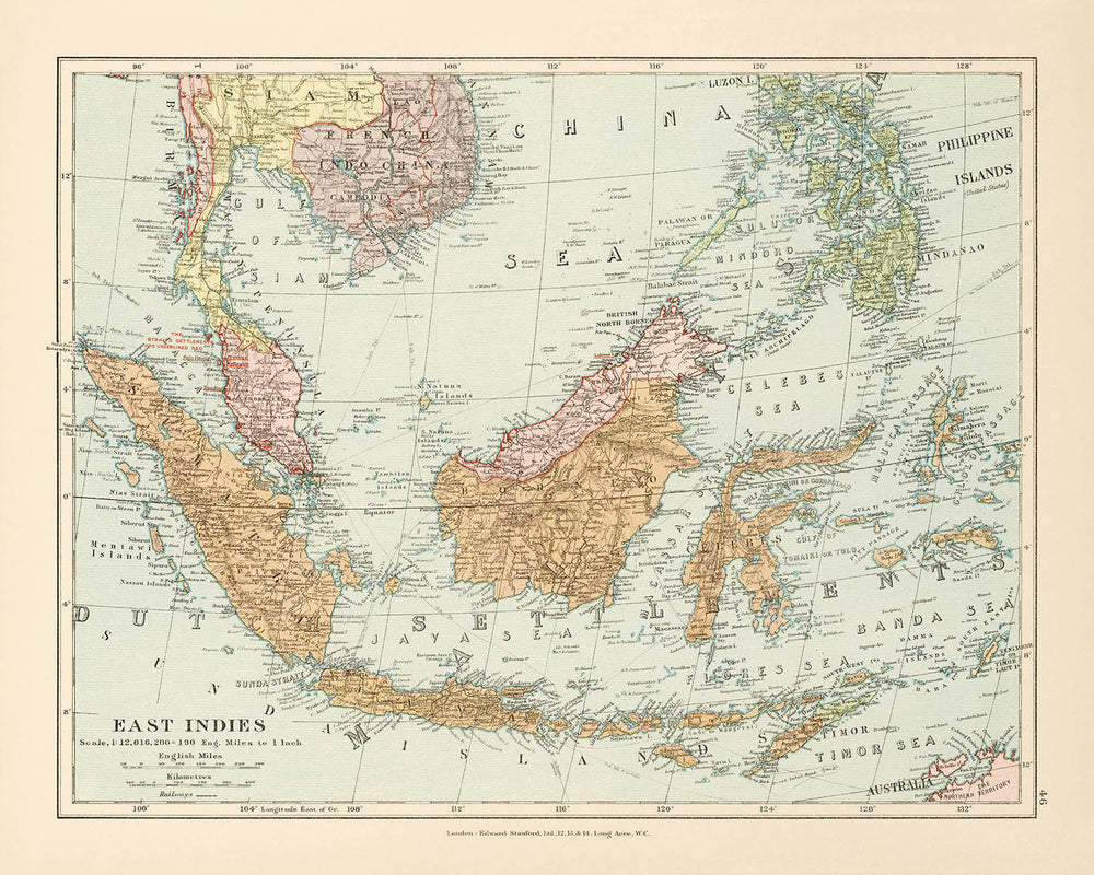 The "East Indies" map, crafted by the renowned Edward Stanford Ltd. in 1926, is a captivating glimpse into the geopolitical and geographical landscapes of Southeast Asia during the early 20th century. This map, part of Stanford's prestigious London atlas of universal geography, reflects the meticulous craftsmanship and cartographic expertise that Edward Stanford Ltd. was celebrated for. The map beautifully delineates the political boundaries of the time, offering a historical snapshot of regions that include modern-day Indonesia, Malaysia, Brunei, Singapore, Timor-Leste, and the Philippines, as well as parts of Thailand, Cambodia, and Vietnam.