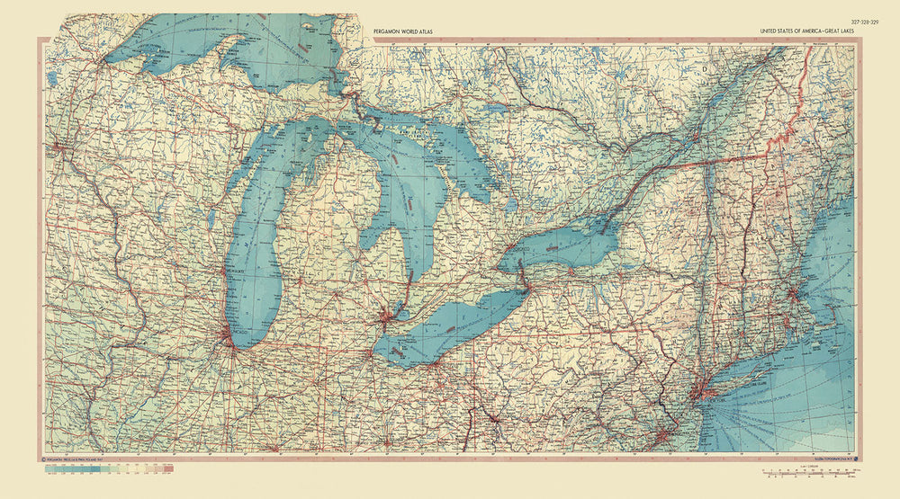 Immerse yourself in the intricate details of the 'United States of America - Great Lakes' map, a fascinating cartographic masterpiece from the archives of the Polish Army Topography Service, published in 1967. This is not just a map, but a rich tapestry of history, geography, and artistry that invites you to explore the captivating terrain of the Great Lakes region. The map is an excellent representation of the region's political and physical features, with each of the Great Lakes - Michigan, Huron, Ontario, Erie, and Superior - beautifully depicted. This map, with its detailed portrayal of the Great Lakes, extends as far as Boston in the east, Quebec in the north, Minneapolis in the west, and Indianapolis in the south.