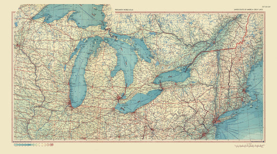 Old Map of the Great Lakes, 1967: Lake Michigan, Lake Huron, Lake Ontario, Lake Erie and Superior.