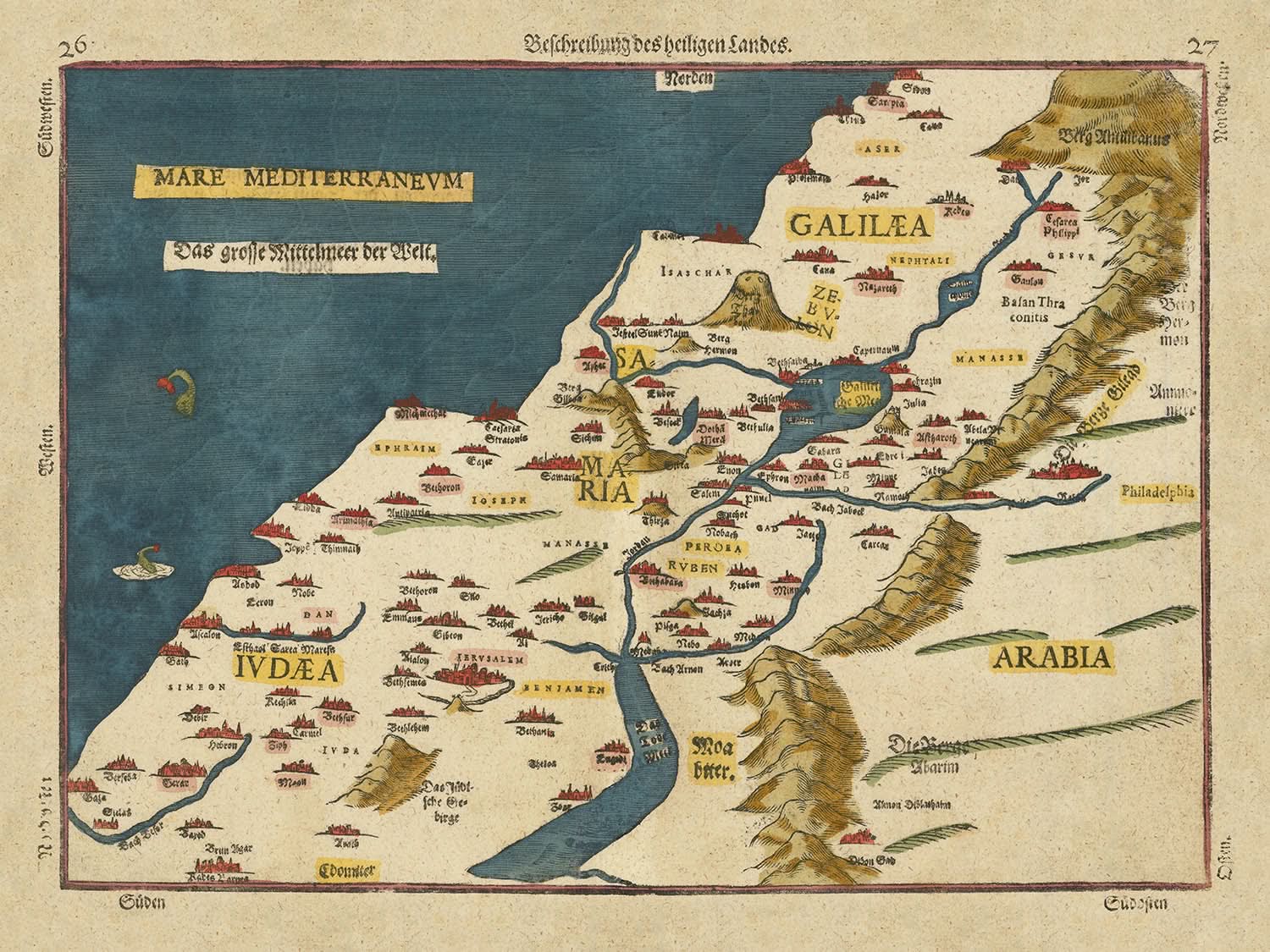 Natural features are elegantly illustrated, with the Jordan River flowing gracefully through the landscape and the Dead Sea depicted with artistic flair. The map also showcases prominent mountains, including Mount Carmel, adding depth and dimension to the geography. In the Mediterranean Sea, whimsical sea monsters and ships add a touch of fantasy, reflecting the artistic conventions of the time. These elements not only enhance the map's aesthetic appeal but also serve as reminders of the myths and legends that have long been associated with these storied waters.