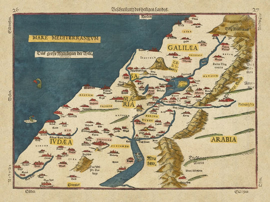 Heinrich Bunting's "Beschreibung des Heiligen Landes" is a captivating 16th-century cartographic masterpiece that offers a vivid depiction of the Holy Land as it was understood in 1581. This map is a testament to Bunting's dedication to illustrating the geography of biblical narratives, combining both political and physical elements to bring the ancient world to life. The map extends from Gaza and Moab to the northern mountains beyond the Jordan River, meticulously detailing the territories of the 12 tribes of Israel. Its artistic style, complete with vibrant colors and imaginative illustrations, captures the viewer's imagination and transports them to a time when biblical stories shaped the understanding of the world.