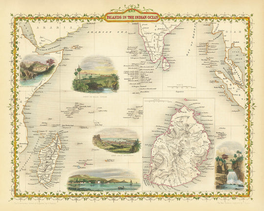 The map’s design is a testament to Tallis’s unique cartographic style. Encased within an ornate decorative border, the map is adorned with exquisitely detailed vignettes that bring the region to life. These illustrations, such as the bustling harbor of Port Louis in Mauritius and the scenic coastline of Point De Gall in Ceylon, offer a rare glimpse into the landscapes and daily life of the mid-19th century. The full-color rendering and careful labeling of towns, rivers, and coastal features provide both visual delight and historical insight.
