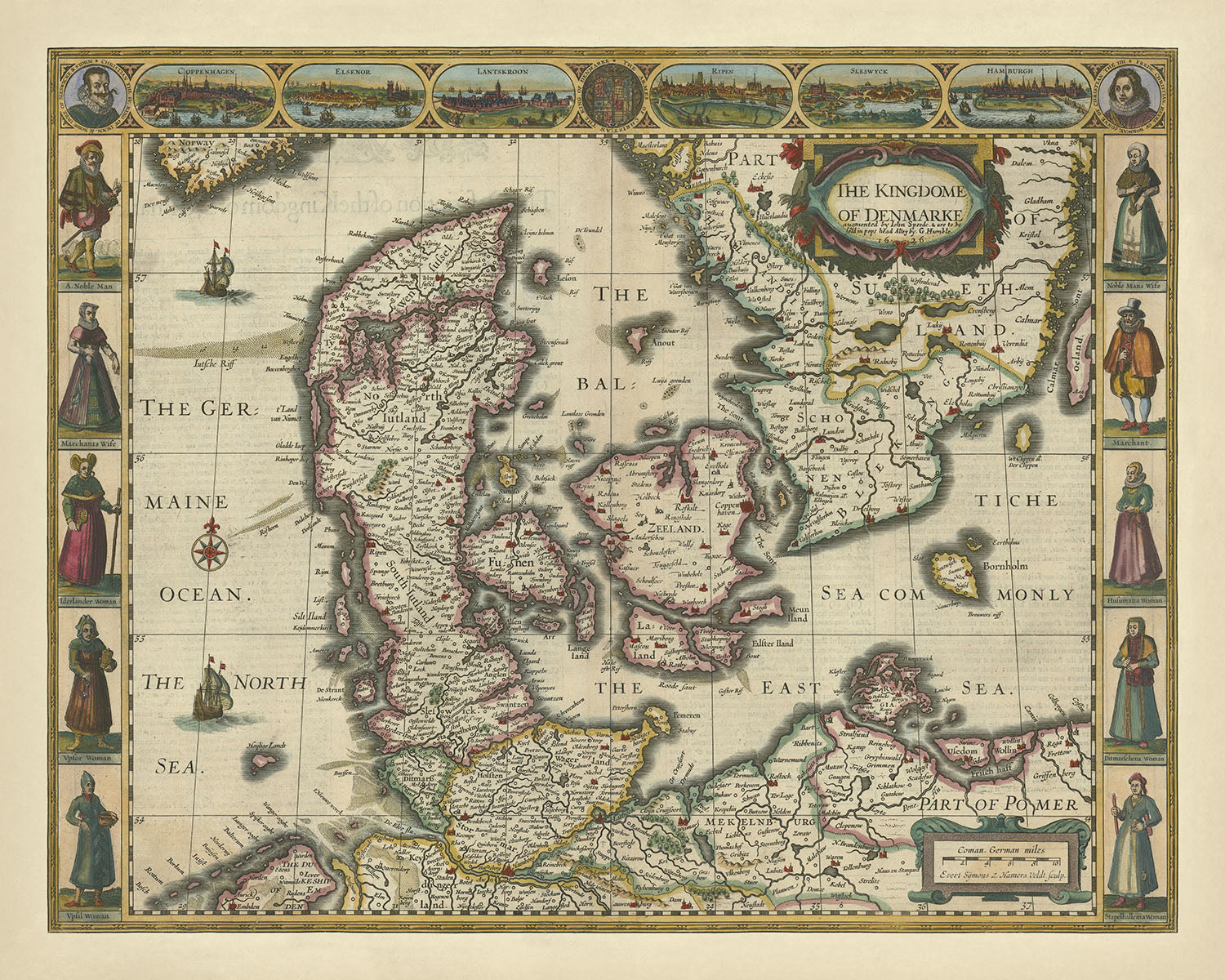The design and style of the "Kingdome of Denmarke" map are quintessentially 17th century, characterized by its elaborate decorations and intricate details. The side panels featuring costumed figures provide a fascinating insight into the attire and social customs of the period. This map is more than just a geographical document; it is a cultural artifact that captures the essence of a bygone era. Its historical significance lies not only in its depiction of Denmark's geography but also in its portrayal of the cultural and political landscape of the time, making it a valuable addition to any collection of historical maps.