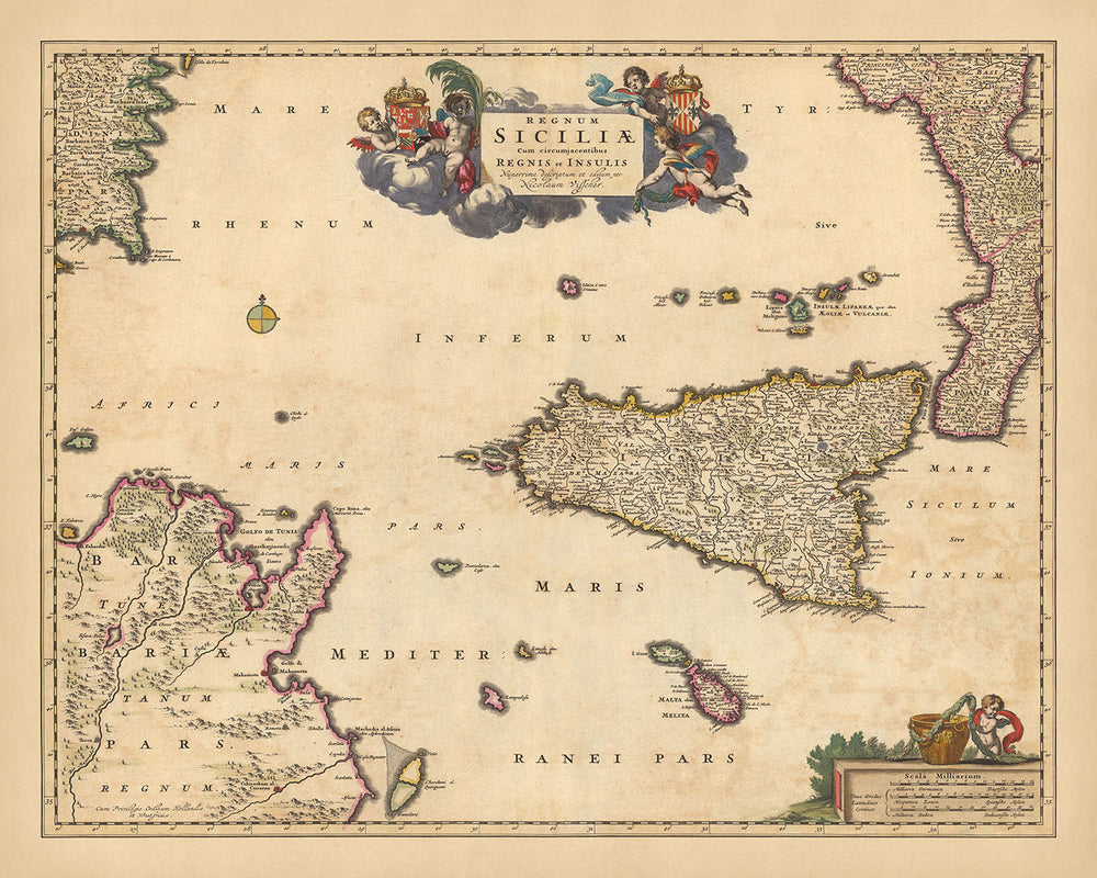 Old Map of the Kingdom of Sicily by Visscher, 1690: Palermo, Catania, Tunis, Malta, Parco dell'Etna