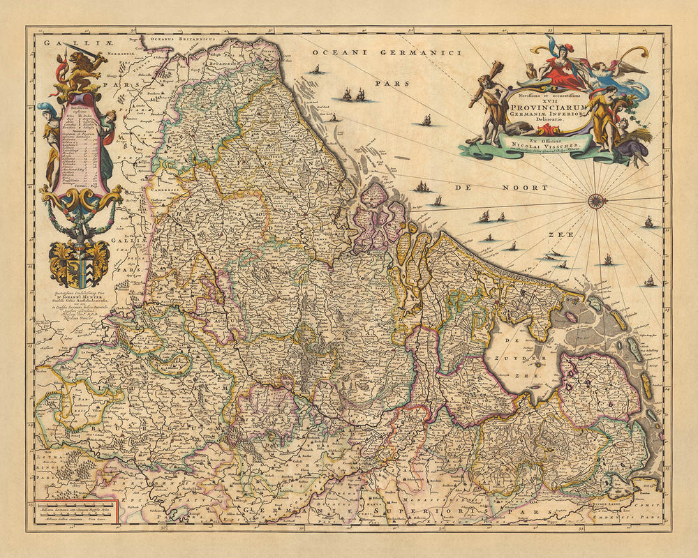 Immerse yourself in the rich tapestry of history with this intricate map of The Seventeen Provinces, meticulously crafted by Nicolaes Visscher II in 1690. The 'Novissima et accuratissima XVII provinciarum Germaniae Inferioris delineatio' or 'The Newest and Most Accurate Delineation of the Seventeen Provinces of Lower Germany' provides a captivating glimpse into the political and geographical divisions of the late 17th century Low Countries, which encompass modern-day Netherlands, Belgium, and Luxembourg.