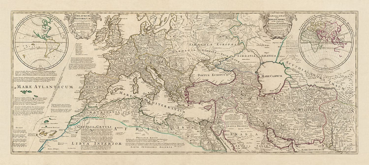 This is an exceedingly rare, full colour map, originally created in 1709 of the late Roman Empire as it was in 400AD and its surroundings, just before its downfall began.