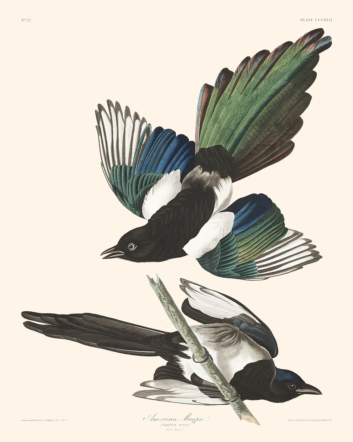 The vivid contrasts of black, blue, and green hues in the Magpie’s feathers, as depicted by Audubon, bring a dynamic and vibrant element to any space. Observers will appreciate the meticulous rendering of textures and patterns, showcasing Audubon’s skill in combining scientific accuracy with artistic mastery. By owning this print, you capture a piece of natural history rendered through the eyes of one of America's greatest artists.