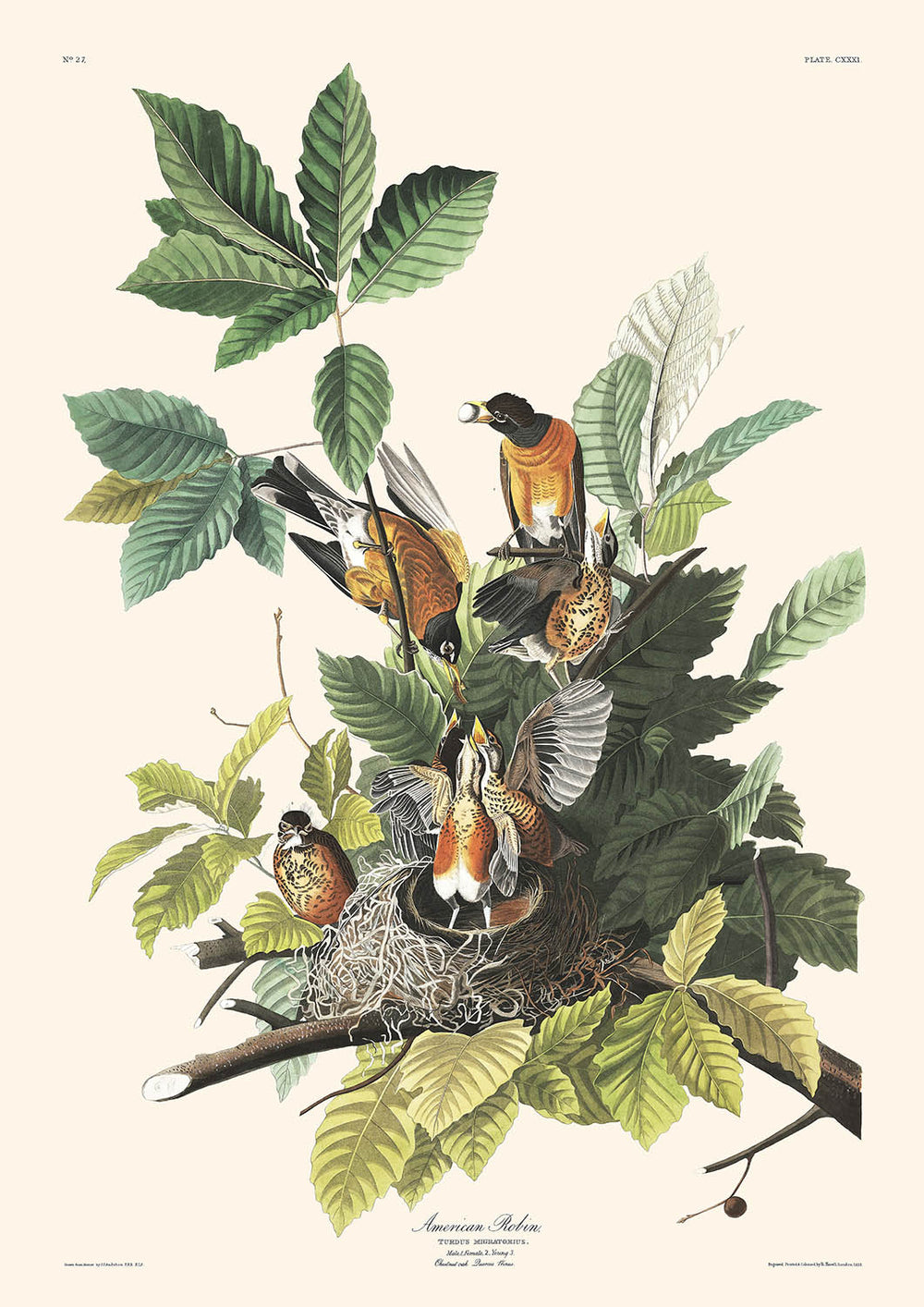 American Robin (Plate 131) by John James Audubon, first published in 1827, enriches the cherished collection in Audubon’s Birds of America, a magnum opus renowned for its detailed, life-size depictions of American birds. This striking illustration captures the American Robin in its natural splendor, symbolizing the artist's emotional connection to this beloved bird.