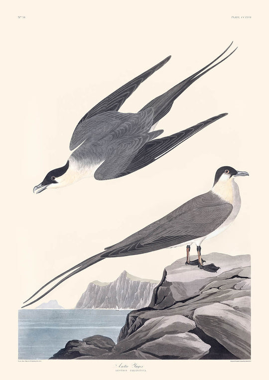 The Arctic Yager illustration is notable for its dynamic representation of the bird in flight, showcasing its powerful and agile nature. Audubon’s use of vibrant colors and detailed brushwork bring the Arctic Yager to life, highlighting its distinctive features and capturing its predatory grace in action. This print serves as a fascinating glimpse into the bird's behavior, as described by Audubon himself.