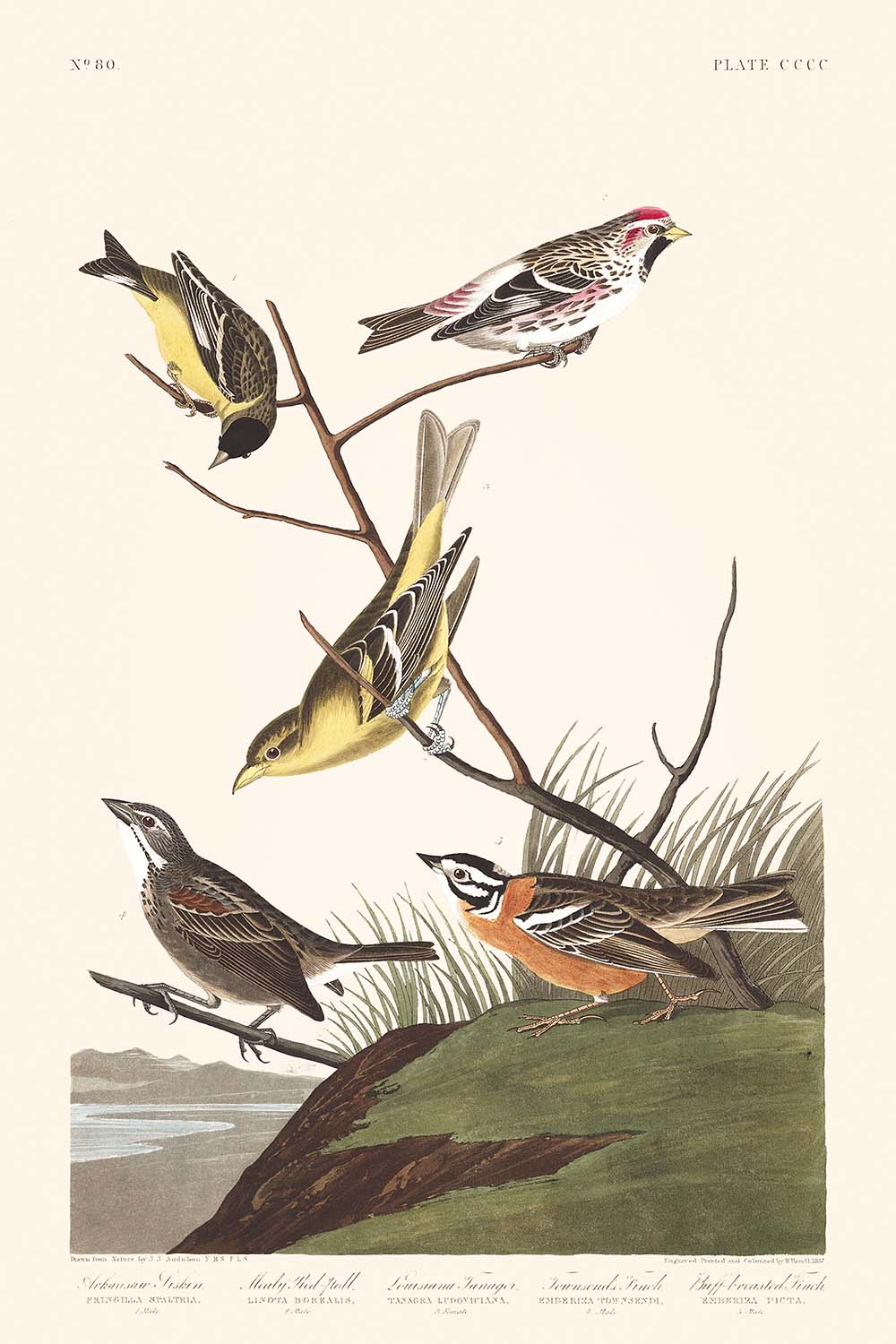 Arkansaw Siskin, Mealy Red-poll, Louisiana Tanager, Townsend's Bunting, Buff-breasted Finch by Audubon, 1827