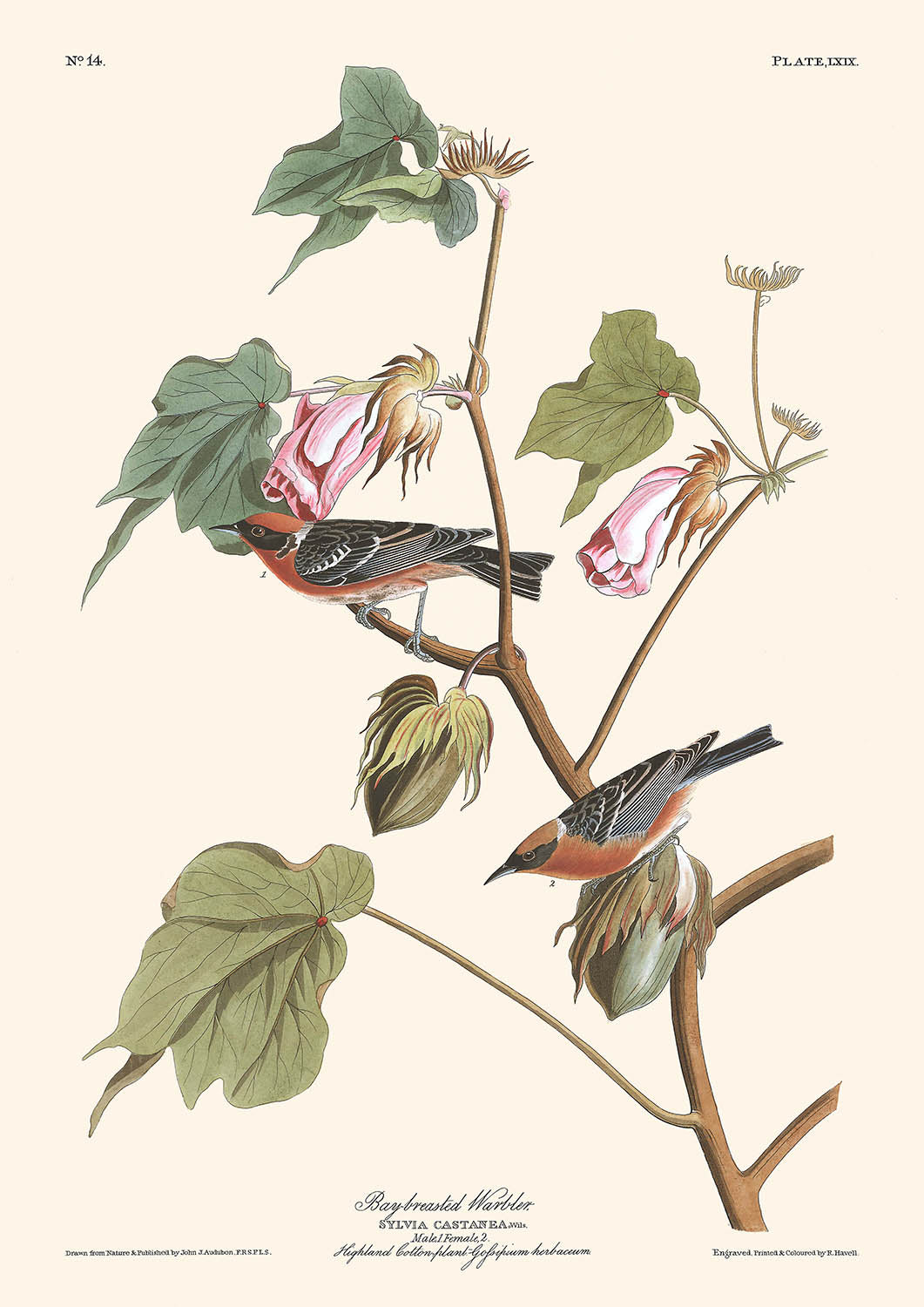The Bay-breasted Warbler itself is a captivating subject. Audubon documented how it migrates through the United States only briefly, with sightings in diverse states from Pennsylvania to Louisiana. The male Bay-breasted Warbler is distinguished by its chestnut-red head and fore-neck, with striking black and yellowish-white accents, making it a visual delight for any bird enthusiast.