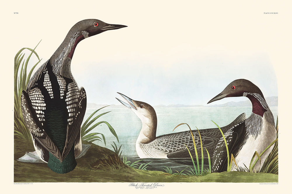 Black-Throated Diver, first published in 1827, is an exquisite bird illustration from John James Audubon’s magnificent series, The Birds of America. This detailed portrayal captures the beauty and elegance of the Black-Throated Diver, an extraordinary bird known for its extensive northern migrations and reclusive nesting habits.