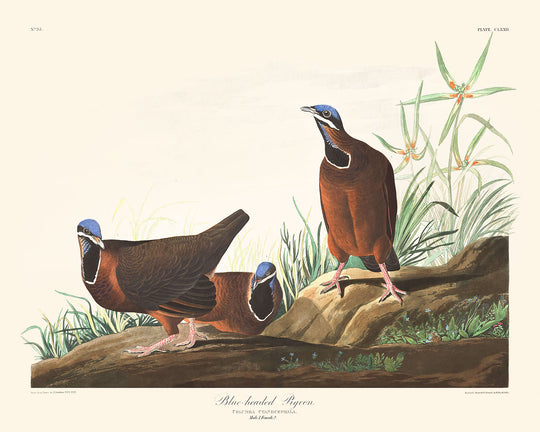 Blue-headed Pigeon, first published in 1827, is one of the most captivating illustrations from John James Audobon's magnum opus, The Birds of America. A few of these birds migrate each spring from the Island of Cuba to the Keys of Florida, but are rarely seen due to the tangled woods they inhabit. Audubon has meticulously represented three of these Pigeons on the ground, surrounded by the creeping plants native to the Keys.