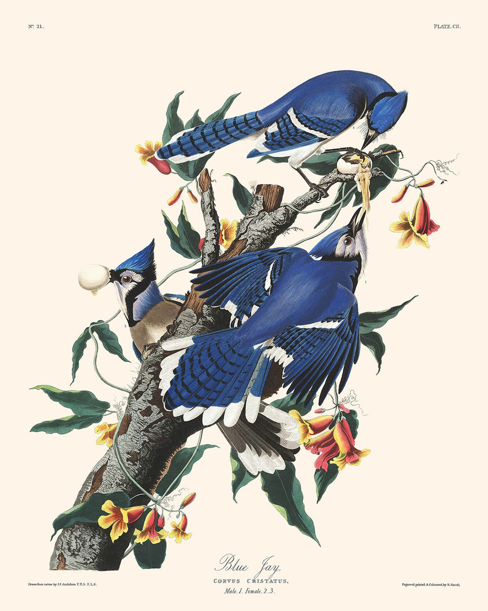 The "Blue Jay," first published in 1827, is a dazzling illustration from John James Audubon's seminal work "The Birds of America." This particular plate features three Blue Jays, depicted with a keen eye for detail and an undeniable flair for the dramatic, capturing their mischievous personalities in full display.