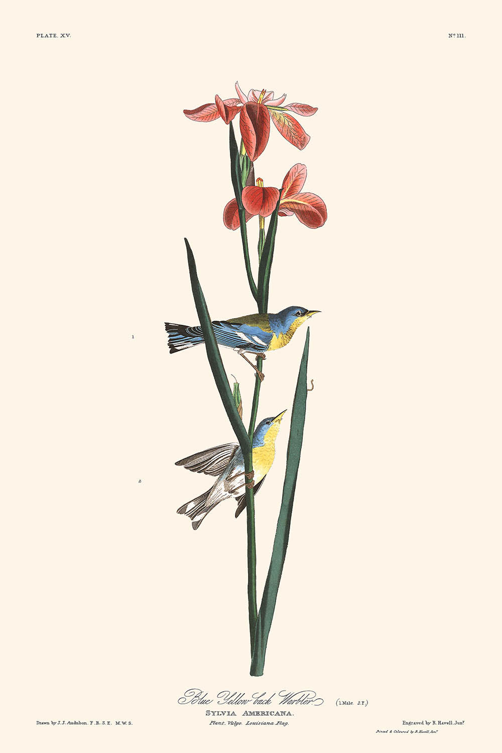 Blue Yellow back Warbler, first published in 1827, is a striking and delicate illustration from John James Audubon's renowned work, The Birds of America. This delightful illustration captures the lively Blue Yellow back Warbler perched amidst vibrant irises, a hallmark of Audubon's unparalleled skill in depicting avian life.