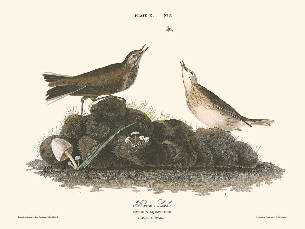 "Brown Lark (Plate 10)," first published in 1827, is a captivating illustration from John James Audubon's seminal work, The Birds of America. With its taut detailing and realistic portrayal, this piece masterfully captures the elegance and subtle beauty of the lark.