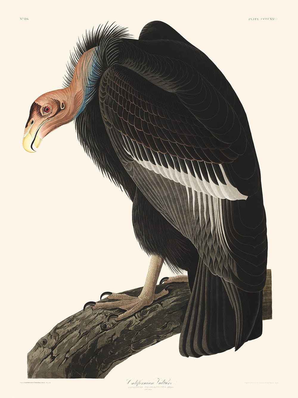 Presenting "Californian Vulture" by John James Audubon, originally published in 1827, this compelling bird illustration showcases one of the largest and most majestic vulture species in North America. Derived from Audubon's treasured "The Birds of America," this artwork captures the grandeur and nuances of this magnificent bird native to the western valleys and plains of North America.