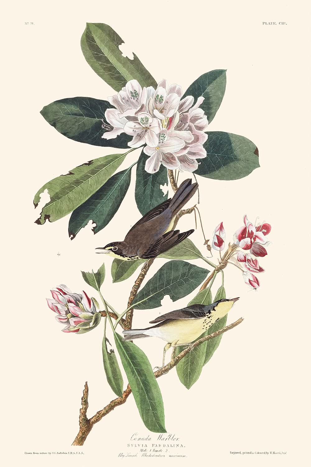 Canada Warbler, first published in 1827, is a quintessential masterpiece by John James Audubon from his seminal work, The Birds of America. The illustration captures the elegance and vibrancy of the Canada Warbler amidst the lushness of nature, reflecting Audubon's profound love of the avian and natural worlds.