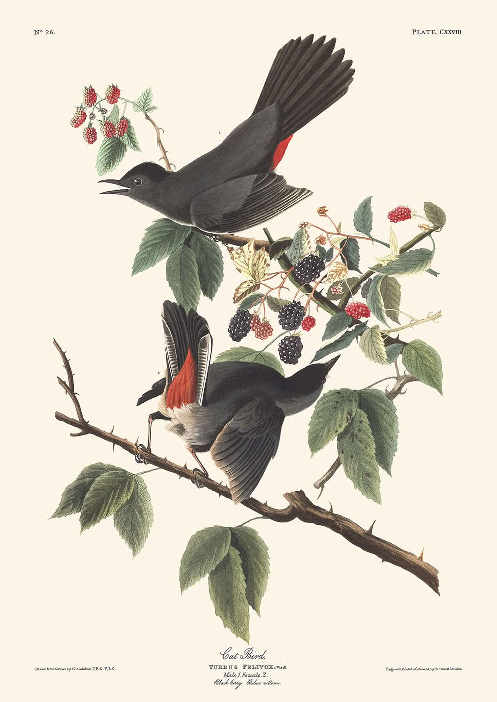 John James Audubon’s "Cat Bird", originally published in 1827 as Plate 128 of the renowned "Birds of America", captures the vivid essence of this charming songbird. Audubon, an eminent figure in natural history art, has depicted the Cat Bird with meticulous detail and characteristic grace, bringing to life the creature’s elegance and playful demeanor.