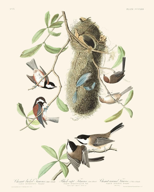 Chesnut-backed Titmouse, Black-capped Titmouse, and Chesnut-crowned Titmouse, first illustrated in 1827 by John James Audubon, is a captivating depiction from his celebrated work, The Birds of America. This artwork intricately presents these charming birds in their natural elegance, reflecting Audubon's meticulous attention to detail and passion for ornithology.